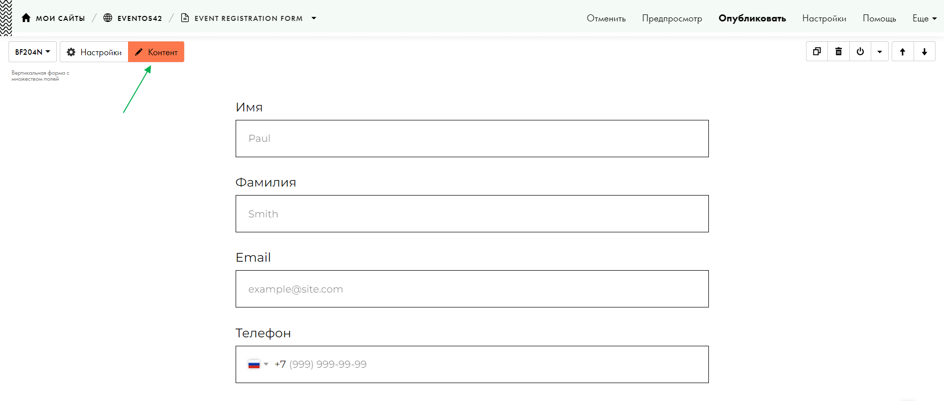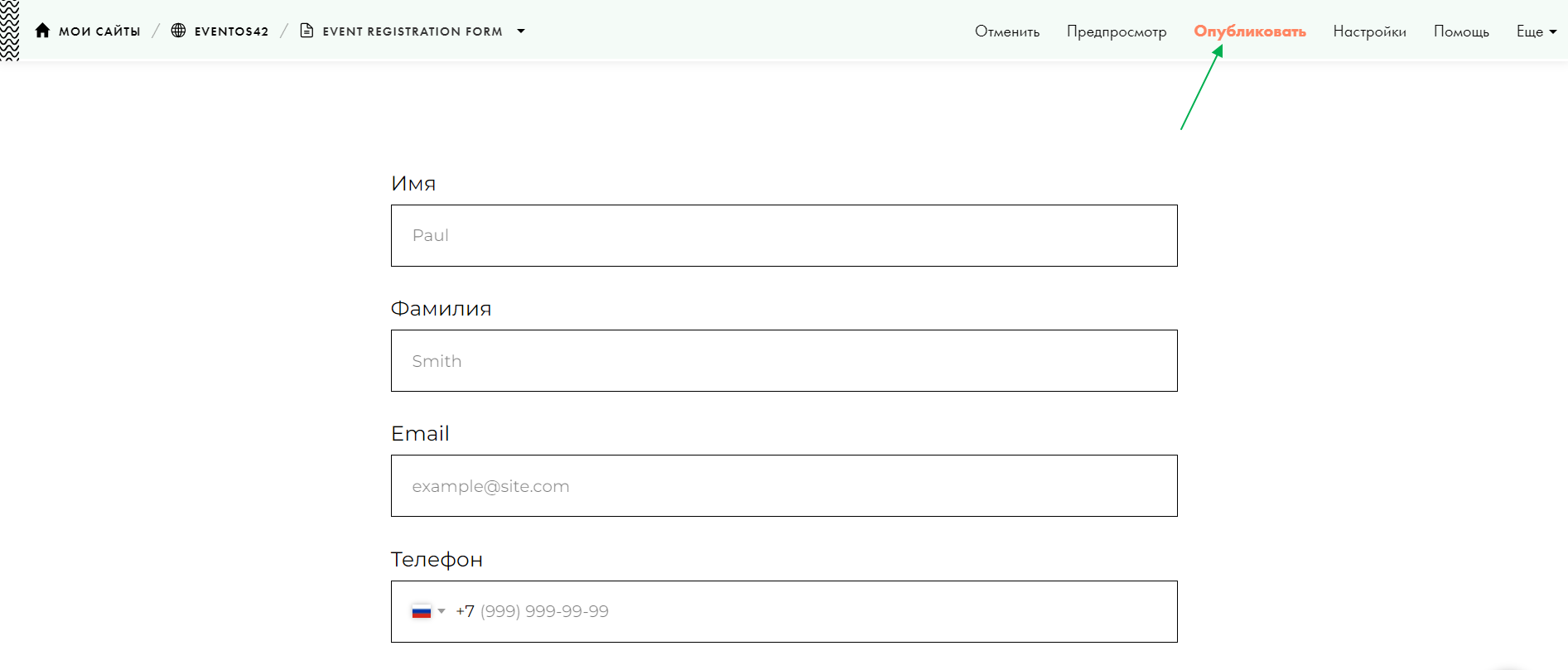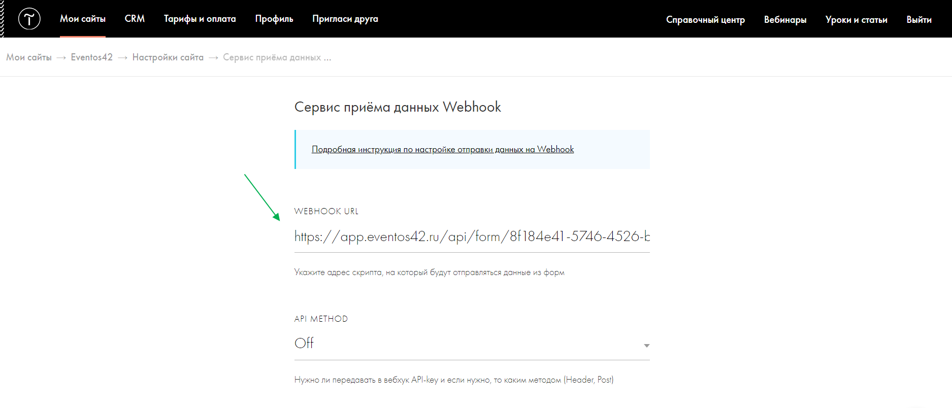 Перейдите в настройки Webhook и введите в параметре WEBHOOK URL адрес [https://app.eventos42.ru/api/form/@token@], где вместо @token@ надо подставить адрес формы регистрации из Eventos 42. Как получить адрес формы описано тут.