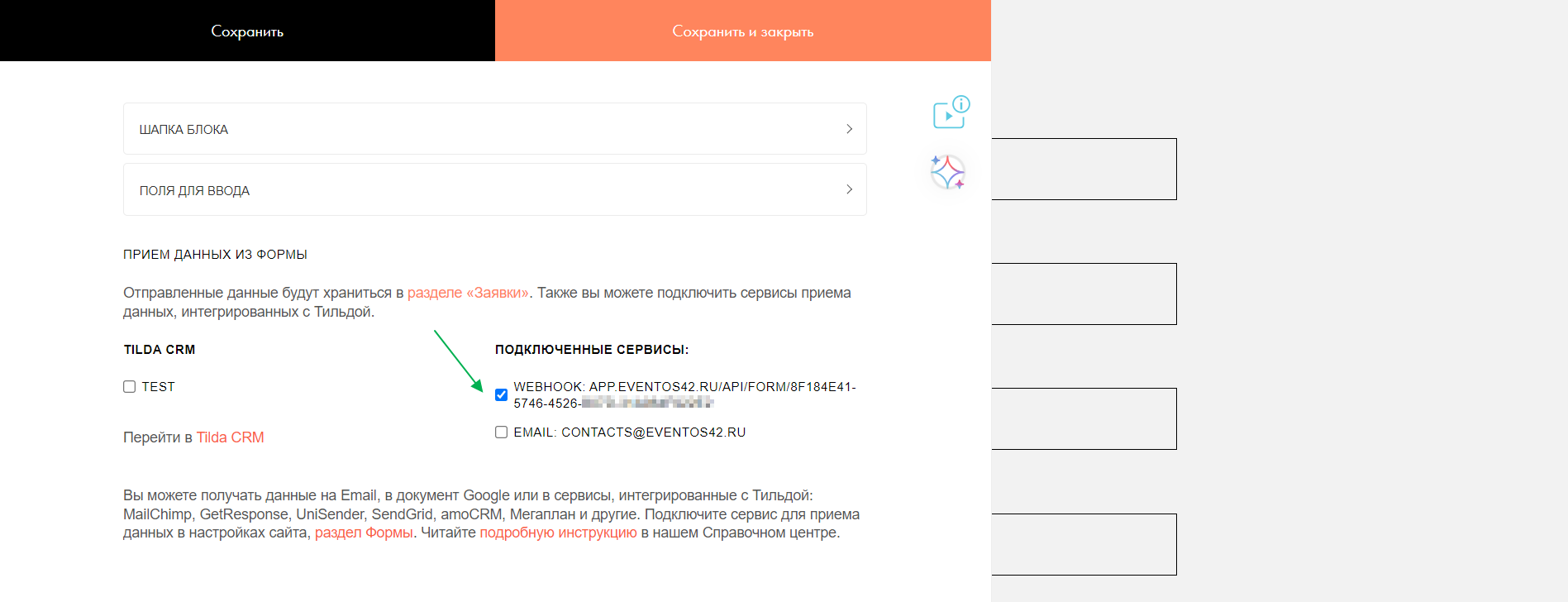 1. В Tilda добавьте возможность отправки данных из форм через webhook