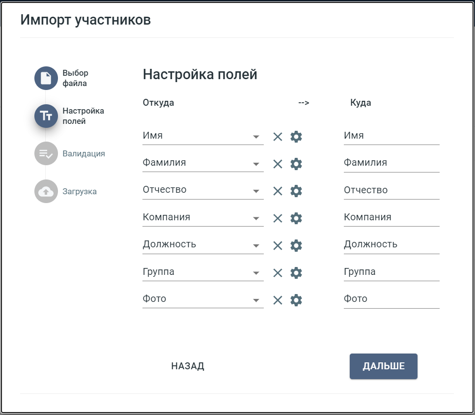 В настройке полей выберите из каких столбцов в какие поля следует импортировать данные